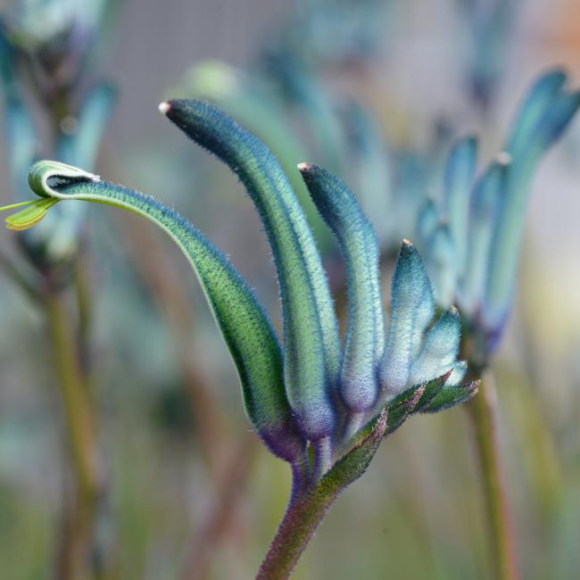 'Masquerade' is a spectacular kangaroo paw that produces eye-catching teal and purple flowers that contrast beautifully against its cool blue-green strappy foliage.